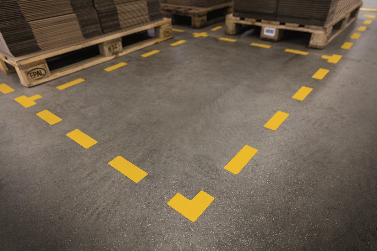 Självhäftande golvmärkningssymbol för markering eller avgränsning inomhus. Fäster på rena och torra betonggolv. Slitstarka och tåliga med halkskyddsgrad R9 i enlighet med DIN 51130. 10 st/förp.