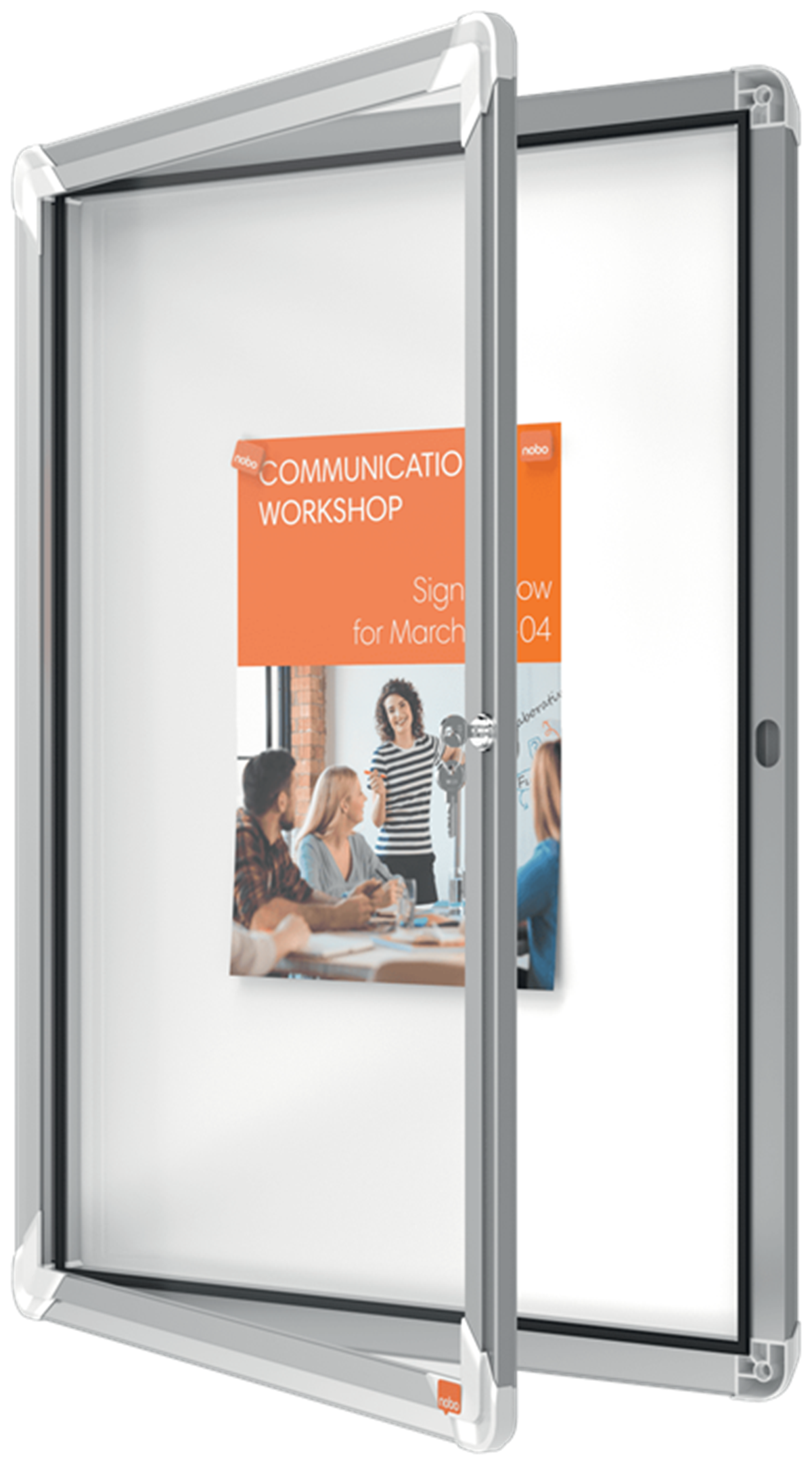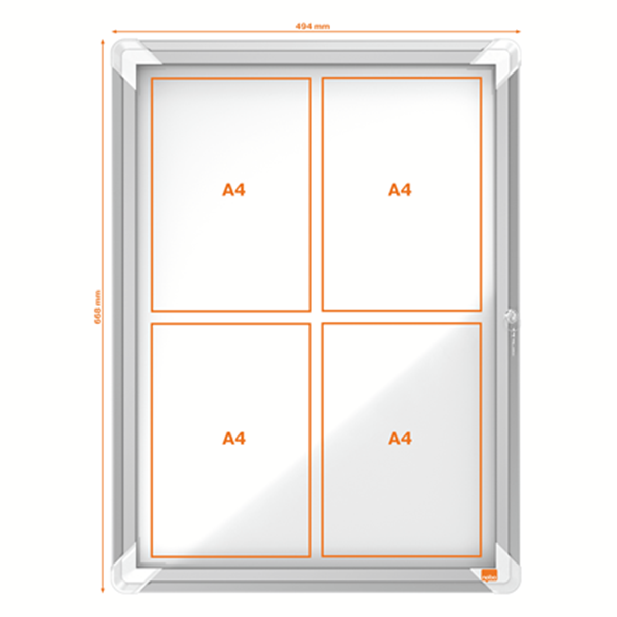 Låsbar magnetisk anslagstavla med säkerhetsglasdörr på gångjärn samt sidolås. Modern snygg ramkant av aluminium och hörnfästen för genomgående montering. Utmärkt magnetisk anslagstavla för att säkert visa dina meddelanden. Mått: 530 x 690 x 45 mm. 10 års garanti.