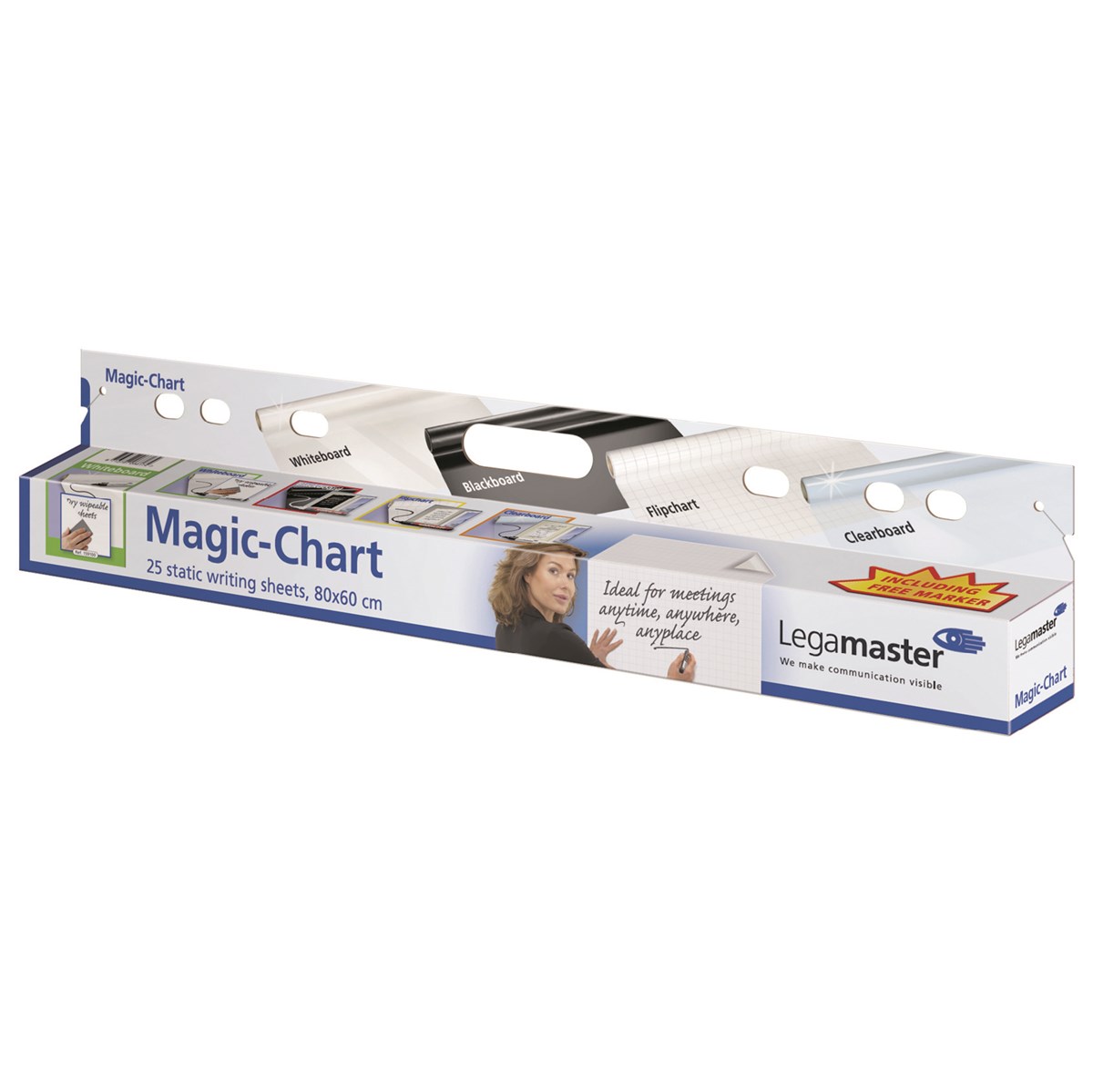 En statisk skrivfilm i polypropylen, fäster på de flesta underlag (betong, glas, tapet, trä etc.). Förpackningen passar på alla förekommande blädderblocksstativ. Rulle om 25