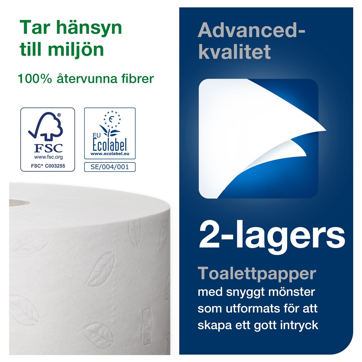 Vitt, 2-lags toalettpapper. Grå dekorprägling. 360 m. 6 rullar/förp. Passar till Tork hållare T1.